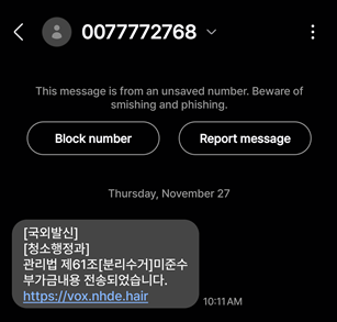 전형적인 스미싱 기법으로, 정부 기관을 사칭한 문자를 전송해 APK 설치를 유도한다. (SMS + 피싱)