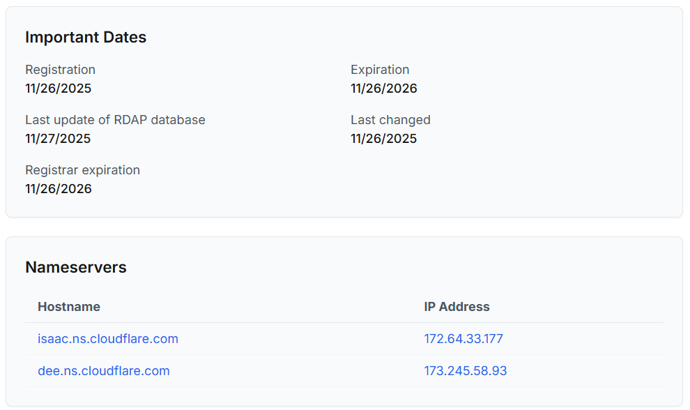 그리고 이 도메인은 11월 26일에 등록되었고, 클라우드플레어와 연결되어 있다는 점도 알 수 있었다.