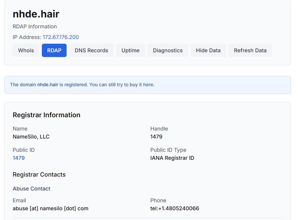 NameSilo라는 도메인 제공 업체를 통해 도메인을 구입했다는 사실을 알 수 있다.